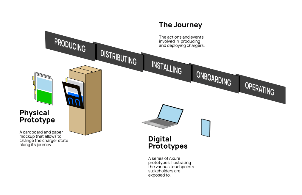 In collaboration with the Product Manager for next-gen chargers, we developed a vision called “From Factory to Field”, aimed at mapping every process and stakeholder involved, from charger inception at the factory to full functionality at the site. I organized a series of co-creation workshops with internal teams and customer representatives, resulting in:
